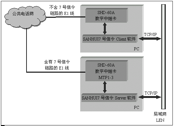數(shù)字中繼卡上的DSP完成7號(hào)信令MTP第一至第三層的信令鏈路處理,由驅(qū)動(dòng)軟件完成TUP和ISUP層的協(xié)議處理,包含有7號(hào)信令鏈路的微機(jī)作為server,通過TCP/IP協(xié)議為其它不包含信令鏈路的client提供接續(xù)控制。
