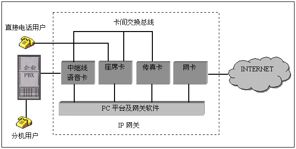 在PC機(jī)平臺(tái)內(nèi),可插入三種不同類型的語音卡,中繼卡用于連接企業(yè)原有的用戶交換機(jī),使得分機(jī)用戶可以通過IP網(wǎng)絡(luò)接打電話,中繼線可采用模擬線或數(shù)字中繼線、座席卡用于直接連接電話用戶,常用于沒有用戶交換機(jī)的場(chǎng)合;傳真卡用于完成IP網(wǎng)絡(luò)上的傳真中繼功能。所有的語音卡之間采用卡間交換總線相連,以便實(shí)現(xiàn)互相通話和傳真資源共享。PC平臺(tái)內(nèi)一般還需要網(wǎng)卡實(shí)現(xiàn)與INTERNET的連接。網(wǎng)關(guān)軟件是該IP網(wǎng)關(guān)的關(guān)鍵部分,完成對(duì)語音卡的控制和IP協(xié)議處理。
