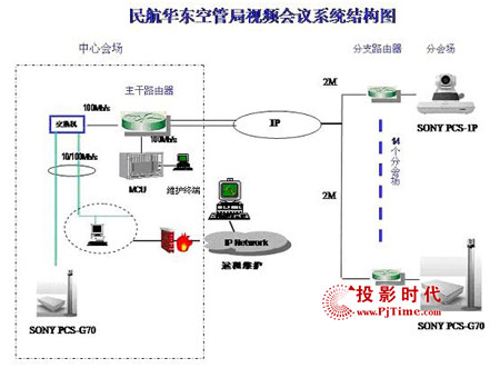 為了建成“具有華東特色,符合總局要求”的視頻會議系統(tǒng),空管局領(lǐng)導(dǎo)經(jīng)過嚴(yán)格的考察和甄選后,最后采用了Sony的視頻會議系統(tǒng)解決方案,包括5臺PCS-G70和10臺PCS-1P。整個項目運行在民航數(shù)據(jù)網(wǎng)(ATM網(wǎng))的環(huán)境下,共有24個節(jié)點,設(shè)備分布呈星型結(jié)構(gòu)。
