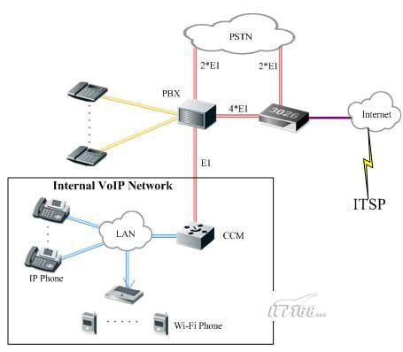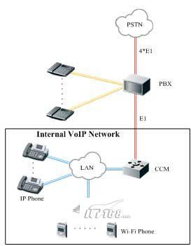酒店申請了4條到CNC的E1線路,用于語音呼叫業(yè)務(wù),同時內(nèi)部還建設(shè)有覆蓋整個酒店的VoIP網(wǎng)絡(luò),通過CCM系統(tǒng)進行集中管理,CCM系統(tǒng)與PBX之間通過E1線進行連接。