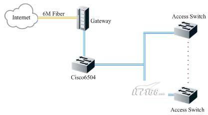 客房局域網(wǎng)通過一條6M的光纖接入CNC網(wǎng)絡(luò),網(wǎng)關(guān)設(shè)備承擔了DHCP、NAT和流量限制等功能,同時在思科6504上安裝有安全板卡,對內(nèi)部網(wǎng)絡(luò)安全進行加強和防御。由于每個客房有2~3個信息點,客房局域網(wǎng)總共有1300個左右的信息點。