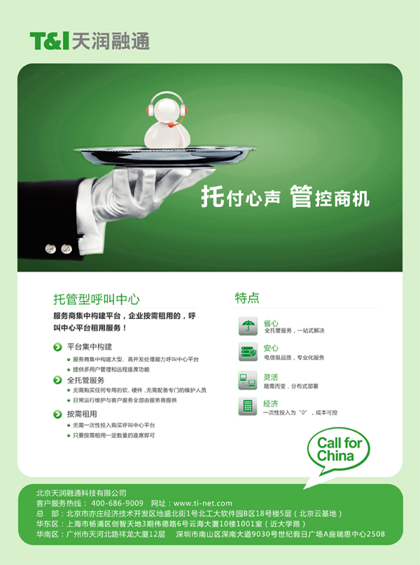北京天潤(rùn)融通科技有限公司致力于為企業(yè)提供簡(jiǎn)單、易用、可依靠的托管型呼叫中心服務(wù),幫助企業(yè)更好地經(jīng)營(yíng)其客戶資源。天潤(rùn)融通是國(guó)內(nèi)呼叫中心領(lǐng)域內(nèi)領(lǐng)先的“云應(yīng)用”提供者。先后承接了百度全國(guó)客服中心、平安保險(xiǎn)北京客服中心、慧聰網(wǎng)呼叫中心、央視網(wǎng)絡(luò)客服中心、安博教育客服中心、圓通快遞客戶服務(wù)中心、飯統(tǒng)網(wǎng)客戶訂餐中心等大型的呼叫中心項(xiàng)目。服務(wù)的客戶遍及互聯(lián)網(wǎng)、教育培訓(xùn)、金融服務(wù)、旅游票務(wù)、電子商務(wù)、食品飲料、醫(yī)療保健、消費(fèi)品制造和銷售、物流、餐飲娛樂、電視購(gòu)物等十多個(gè)領(lǐng)域達(dá)數(shù)千家企業(yè)客戶。