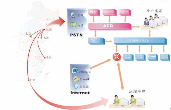 對(duì)于地區(qū)分布廣泛,而又要集中管理的企業(yè),可在各個(gè)局部地區(qū)設(shè)置遠(yuǎn)端座席,并通過(guò)網(wǎng)絡(luò)方便的接入中心系統(tǒng)。我們?yōu)檫h(yuǎn)端座席提供與中心座席完全相同的操作,遠(yuǎn)端座席可以根據(jù)各個(gè)地區(qū)的特定情況有針對(duì)性的處理各個(gè)局部地區(qū)的業(yè)務(wù),為中心分流壓力,同時(shí)中心系統(tǒng)也可以完全掌握遠(yuǎn)端座席的情況。我們可以非常明確的一點(diǎn)是:采用分布式座席的技術(shù),使得遠(yuǎn)端座席與中心座席除了地域上的差異,其它部分完全相同?梢哉f(shuō)只要網(wǎng)絡(luò)無(wú)極限,座席分布就是無(wú)極限的。