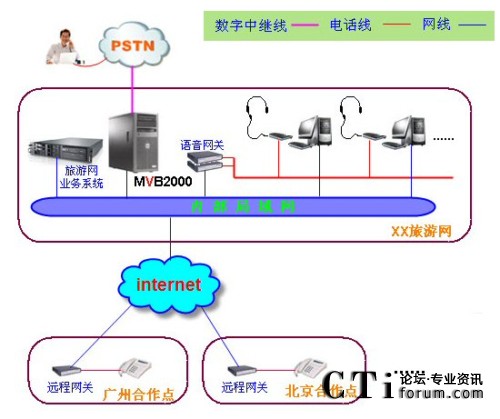 在技術(shù)上,旅游網(wǎng)IP呼叫中心解決方案的語(yǔ)音業(yè)務(wù)通過(guò)電信運(yùn)營(yíng)商的模擬電話線路(或者模擬中繼線路)接入,數(shù)據(jù)業(yè)務(wù)都通過(guò)互聯(lián)網(wǎng)使用TCP/IP協(xié)議傳送,解決了呼叫中心中大量數(shù)據(jù)傳送的需求,請(qǐng)看下面的網(wǎng)絡(luò)組織結(jié)構(gòu)圖: