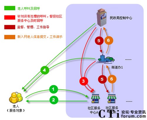 社區(qū)呼叫平臺包含:老人、民政局、街道辦、社區(qū)服務中心四個業(yè)務角色,民政局、街道辦、社區(qū)服務中心通過專用網(wǎng)絡建立高效聯(lián)動機制。