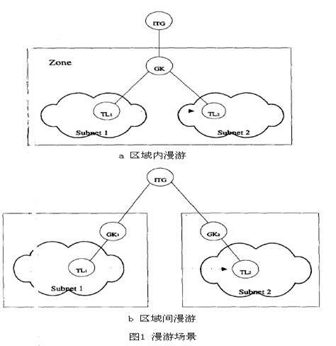 H.323定義中,區(qū)域指由H.323實(shí)體(終端、ITG、MCU)組成的集合,并由一個(gè)網(wǎng)守進(jìn)行管理。每一個(gè)區(qū)域只有一個(gè)網(wǎng)守,但允許多個(gè)子網(wǎng)通過路由器連接進(jìn)來。對于這種多子網(wǎng)單網(wǎng)守的特性,我們發(fā)現(xiàn)這與GSM系統(tǒng)中的服務(wù)區(qū)類似,網(wǎng)守就相關(guān)于HLR或者VLR。服務(wù)區(qū)中有移動(dòng)電話終端和代理管理下的基站,類似的一個(gè)區(qū)域中有多個(gè)子網(wǎng)并都在一個(gè)網(wǎng)守的管理下。當(dāng)移動(dòng)IP電話從一個(gè)子網(wǎng)漫游到另外一個(gè)子網(wǎng)時(shí),IP電話的IP地址就發(fā)生了變化。如果不做移交處理的話,連接將中斷。