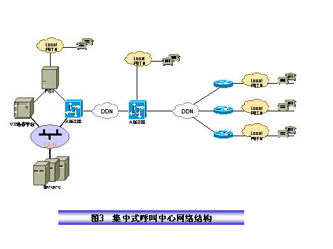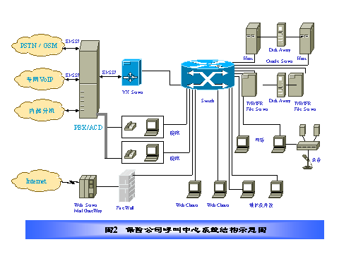 某保險公司電話中心采取全國集中服務方式,其結(jié)構(gòu)如圖2所示,在電話呼叫中心集中管理所有人工語音坐席和電話中心運行所需的所有業(yè)務數(shù)據(jù)、語音文件和硬件設(shè)備,服務全國。我們設(shè)計的方案具有如下特點: