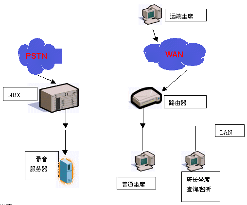 基于3Com NBX呼叫中心的錄音監(jiān)聽系統(tǒng)的拓?fù)浣Y(jié)構(gòu)圖如下: