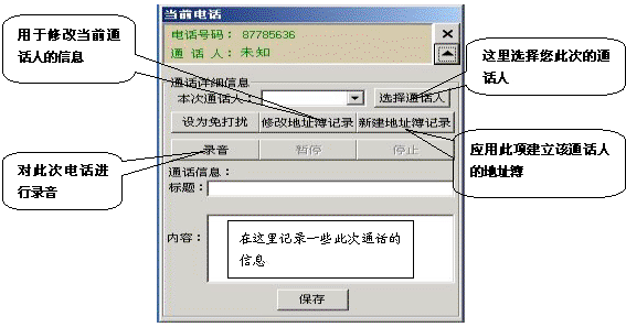 如果有電話打入時,在屏幕的右側會彈出一個對話框,它顯示了當前來電的號碼和通話人(如果在地址簿中沒有記錄則顯示為未知),點擊彈出全部菜單功能,它相當于一個功能強大的通話記事本,用它既可以邊接聽電話邊整理相關通話的文字記錄,又可以錄下通話的全部內容。如果這個電話是您不愿接聽的,也可以將它設置為“免打擾”,這樣,這個號碼以后將存入免打擾名單中,若此號碼再呼入,系統(tǒng)將自動掛斷此呼叫。如果這個電話是您認為的重要客戶打過來的,您也可以將此號碼添加到重要客戶組中,以便您今后接聽或設置電話轉移時能與其它呼入電話相區(qū)分。