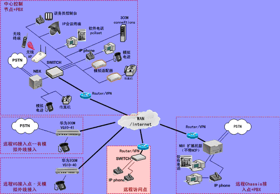 ③.遠程接入的辦公室不再需要專用的 PBX, 只需要將3Com NBX電話終端接入到WAN網中,就能地實現(xiàn)在WAN或Internet上與3Com