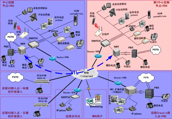 ②.統(tǒng)一的分支機構電話平臺,可以支持任何數(shù)據(jù)骨干網(WAN)技術,包括DDN、幀中繼、VPN、xDSL等。3COM NBX 系統(tǒng)也可以在無線局域網上運行。