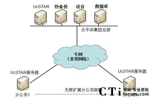 通過(guò)UcSTAR統(tǒng)一通信系統(tǒng)實(shí)現(xiàn)以公司總部為主的星型架構(gòu)的通信系統(tǒng)部署,實(shí)現(xiàn)集團(tuán)內(nèi)部的溝通與協(xié)作應(yīng)用。