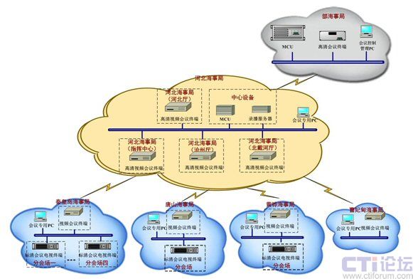 由于前期視頻會(huì)議系統(tǒng)測(cè)試時(shí)表現(xiàn)出來(lái)的良好的兼容性和出色的視音頻效果,河北海事局采用了迪威公司的高清產(chǎn)品及解決方案。按照組織機(jī)構(gòu)的分級(jí)結(jié)構(gòu),部海事局采用現(xiàn)有的高清MCU和本局部的高清終端;河北海事局部署高清MCU,既能召開(kāi)本地視頻會(huì)議,又能與部海事局進(jìn)行級(jí)聯(lián),實(shí)現(xiàn)召開(kāi)大會(huì)的要求,同時(shí)在本地的指揮中心、各會(huì)場(chǎng)放置1臺(tái)高清會(huì)議終端,在下屬海事處配置1臺(tái)標(biāo)清會(huì)議終端。