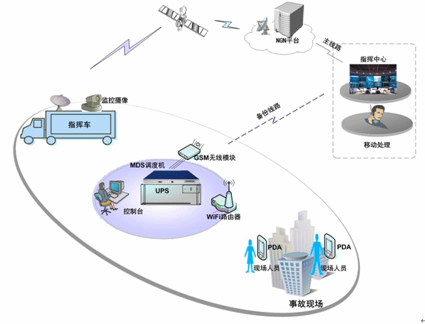 MDS調(diào)度機通過衛(wèi)星道與政府的NGN平臺對接,實現(xiàn)與整個城市的通信系統(tǒng)對接;并通過GSM、CDMA備份線路,實現(xiàn)多通信通道的實時切換,選擇最好的路由進行通信。MDS調(diào)度機負責(zé)語音通訊、調(diào)度作業(yè)和指令消息轉(zhuǎn)發(fā);應(yīng)急指揮車配備調(diào)度機、調(diào)度臺、移動調(diào)度終端、衛(wèi)星接收設(shè)備、監(jiān)控視頻設(shè)備及其他設(shè)備。所有的調(diào)度語音終端都可與MDS調(diào)度系統(tǒng)對接,實現(xiàn)調(diào)度功能及與其他的通信終端進行通信。