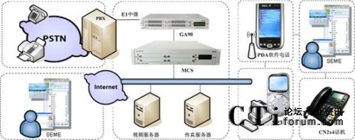 1)由MCS與該企業(yè)原有的大型傳統(tǒng)PBX進行對接,MCS主要處理語音交換,具備IP-PBX和VOIP網(wǎng)關(guān)的功能,還具有IVR(交互式語音應答)和ACD(自動呼叫分配)等呼叫中心功能,并為SEME提供服務(wù)。