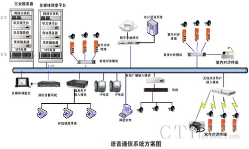 整體解決方案由軟交換服務(wù)器、會議服務(wù)器、錄音服務(wù)器、數(shù)字中繼網(wǎng)關(guān)、調(diào)度臺、有線對講模塊、有線廣播模塊、無線對講模塊等幾部分組成,系統(tǒng)基于IP網(wǎng)絡(luò)部署,所有設(shè)備均直接接入到IP網(wǎng)絡(luò)上,通過IP網(wǎng)絡(luò)匯聚到指揮中心進(jìn)行交換和統(tǒng)一管理調(diào)度。