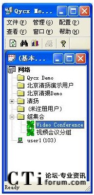 系統(tǒng)已經(jīng)默認(rèn)將這三個(gè)賬戶加入了分組。如上圖所示。 這樣客戶端運(yùn)行起來(lái)以后就可以發(fā)起視頻會(huì)議進(jìn)行視頻會(huì)議了,不需要再在服務(wù)器端進(jìn)行任何操作。這三個(gè)賬戶可以隨意的更改密碼、如果不想使用這三個(gè)賬戶名,可以刪除重新建立賬戶名,除此以外,還可以建立新的賬戶,并加入分組。這些操作都是在服務(wù)器端進(jìn)行的。詳細(xì)的操作請(qǐng)參看用戶手冊(cè)或者是FLASH教程。有了用戶名和密碼以后,無(wú)論走到哪里,使用任意一臺(tái)電腦登錄自己的帳號(hào),就可以參加會(huì)議,這樣就無(wú)需服務(wù)器端總是臨時(shí)變更組成員。