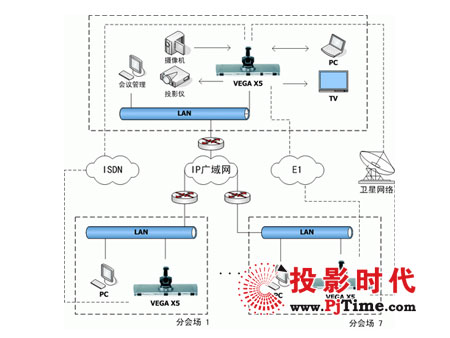 如圖所示,主會(huì)場(chǎng)配置1臺(tái)愛斯樂VegaX5終端,X5最高帶寬可達(dá)4Mbps。內(nèi)置8點(diǎn)混網(wǎng)(IP&ISDN) MCU。在每個(gè)分會(huì)場(chǎng)采用1臺(tái)愛斯樂VEGA X3終端。各會(huì)場(chǎng)根據(jù)網(wǎng)絡(luò)情況,可以采用不同的網(wǎng)絡(luò)接入方式。VEGA X5可以支持寬帶IP、ISDN、專線接入等。且X5的內(nèi)置MCU在召開多點(diǎn)會(huì)議時(shí)可以做雙視頻流傳送,可以同時(shí)看到多會(huì)場(chǎng)的圖像,聲音也是全部混合的。