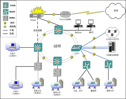 此城域網(wǎng)結構清晰,由核心層的三層交換機只負責數(shù)據(jù)的快速轉(zhuǎn)發(fā),對業(yè)務匯聚和用戶的認證控制任務全部由接入服務器R4000來完成。要求接入服務器支持多種認證手段、加強對各類用戶實現(xiàn)不同級別的控制、為用戶的訪問提供安全保障措施、結合Radius系統(tǒng)提供多種計費功能。