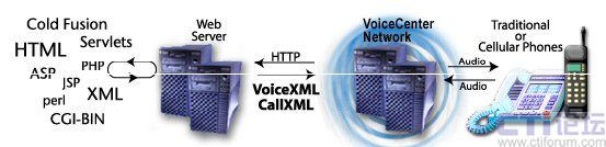 類似地,在Voxeo網(wǎng)絡(luò)上,語音應(yīng)用遵從與標準Web頁面相同的瀏覽器模型。所不同的是,不是采用HTML,而是使用電話標記語言(VoiceXML、CCXML或CallXML)來編寫頁面。經(jīng)過Voxeo VoiceCenter網(wǎng)絡(luò)的處理,這些頁面將把語音返回給呼叫方。如下圖所示:
