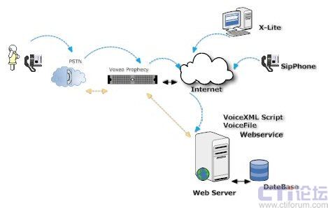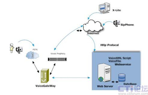 Voxeo Prophecy 是一個(gè)基于SIP、VoiceXML、CCXML標(biāo)準(zhǔn)的語音應(yīng)用開發(fā)和部署平臺(tái),可以讓用戶快速高效的實(shí)施自己的IVR系統(tǒng)。大家都知道,傳統(tǒng)的IVR解決方案廠商,IVR系統(tǒng)架構(gòu)都是基于傳統(tǒng)的CTI硬件來實(shí)現(xiàn)的,無論是交換機(jī)方式還是語音卡方式,都是脫離不開硬件廠家的媒體資源。Voxeo Prophecy 是完全基于互聯(lián)網(wǎng)SIP 協(xié)議,同時(shí)也是VoiceXML標(biāo)準(zhǔn)的聯(lián)盟成員,不受任何硬件廠家的硬件限制。VoiceXML 是一種標(biāo)準(zhǔn)的標(biāo)記語言,用于建立語音界面,好比是我們所熟知的HTML 語言,Voxeo Prophecy 可以理解為傳統(tǒng)的語音瀏覽器,可以解釋VoiceXML 腳本并向用戶顯示語音信息,也可以接受用戶的語音請(qǐng)求,實(shí)現(xiàn)互動(dòng)。如下圖所示: