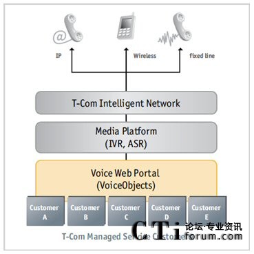 媒體平臺(tái)驅(qū)動(dòng)器提交了高功能性和投資保護(hù)。T-Com選擇VoiceObjects的一個(gè)主要考慮是一組媒體平臺(tái)驅(qū)動(dòng)器,它們作為VoiceObjects服務(wù)器和一百多個(gè)經(jīng)過(guò)VoiceObjects實(shí)驗(yàn)室認(rèn)證的媒體平臺(tái)之間的接口。通過(guò)VoiceObjects服務(wù)器,T-Com享受到了平臺(tái)廠(chǎng)商的無(wú)關(guān)性和應(yīng)用開(kāi)發(fā)工作的投資保護(hù),以及媒體平臺(tái)版本之間、媒體平臺(tái)廠(chǎng)商之間和標(biāo)志語(yǔ)言標(biāo)準(zhǔn)的版本之間(比如從VoiceXML