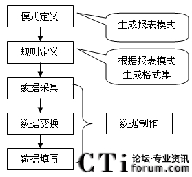 數(shù)據(jù)制作是報表生成過程的最后一個步驟,它在模式定義的基礎上,使用規(guī)則定義生成的映射規(guī)則集合將業(yè)務數(shù)據(jù)映射到報表中。根據(jù)數(shù)據(jù)規(guī)則的內(nèi)容,數(shù)據(jù)制作過程具體可以分為三個步驟,數(shù)據(jù)采集,數(shù)據(jù)變換,數(shù)據(jù)填寫。