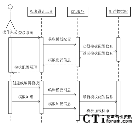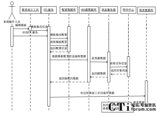 在ETL服務運行時,首先它會從配置數(shù)據(jù)庫中獲取模板的配置信息,并且根據(jù)其配置信息從ODS源數(shù)據(jù)庫中抽取數(shù)據(jù)。ODS源數(shù)據(jù)庫中的數(shù)據(jù)是狀態(tài)服務器從呼叫中心中獲得的。在ETL抽取數(shù)據(jù)后對其進行轉換和加工,將其加載到報表數(shù)據(jù)庫中。并利用報表展現(xiàn)工具將報表數(shù)據(jù)展現(xiàn)出來。其最終設計的系統(tǒng)各部件交互時序圖如圖3.5所示。