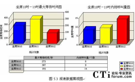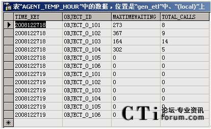 從報(bào)表數(shù)據(jù)庫的相應(yīng)表中,可以看出報(bào)表需要統(tǒng)計(jì)的數(shù)據(jù)信息都以表單形式列出來。圖中的Time Key表示收集數(shù)據(jù)的具體時(shí)刻,object_id表示目標(biāo)對(duì)象在配置數(shù)據(jù)庫中存儲(chǔ)的ID號(hào)。MaxTimeWaiting和Total_Calls屬性對(duì)應(yīng)的是根據(jù)模板項(xiàng)要求統(tǒng)計(jì)的數(shù)據(jù),分別為最大等待時(shí)間和內(nèi)線呼叫總量。下面利用報(bào)表展現(xiàn)工具可以直接將該數(shù)據(jù)展示出來,生成需要的報(bào)表。