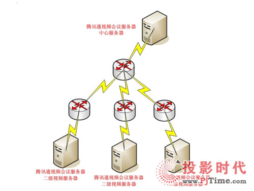 整套視頻系統(tǒng)基于原有IP數(shù)據(jù)網(wǎng)絡,在中心機房建立視騰訊通視頻系統(tǒng)中心服務器,負責二級服務器的連接及控制,用戶數(shù)據(jù)和會議數(shù)據(jù)采用虛擬服務器管理技術,即在不同的虛擬服務器的用戶和會議數(shù)據(jù)不能相互看到,當需要召集不同虛擬服務器用戶的會議時通過管理員進入后臺召集跨虛擬服務器的會議,以實現(xiàn)各個單位之間的大會議的需求。這樣既能快速召開部門內(nèi)小型視頻會議,同時又能分別在各省市支部召開區(qū)域型的大型會議。