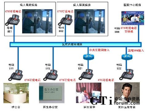 對(duì)于隔離病房的觀察,目前的實(shí)現(xiàn)可以使用遠(yuǎn)程視頻監(jiān)控,或者使用電腦方式來(lái)遠(yuǎn)程視頻交流。視頻監(jiān)控缺點(diǎn)無(wú)法實(shí)時(shí)與病人交流,使用電腦交流則操作比較繁瑣。CTS提出使用可視電話的方案來(lái)彌補(bǔ)當(dāng)前的缺點(diǎn):實(shí)時(shí)與病人交流,可視電話使用操作簡(jiǎn)單。