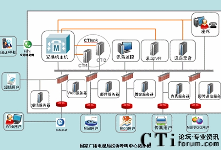 系統(tǒng)主要包含IVR服務器,CTI服務器,短信網關,郵件服務器,傳真服務器,數據庫服務器,座席系統(tǒng)等。客戶撥打特服號碼接入廣電公司客服系統(tǒng),首先由IVR提供自動語音服務。CTI服務器負責所有的電話的路由、排隊、轉接和控制。客戶在接受自動語音服務時,如果需要人工幫助,可選擇轉入人工座席。由IVR系統(tǒng)向CTI發(fā)出轉接請求,完成轉接功能。