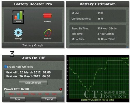 安裝了這么多應(yīng)用,很多同學(xué)會考慮我的電池還能hold的住嗎?此次,特別為大家介紹一款名為Battery Booster Pro的手機(jī)電量管理應(yīng)用,它可以通過自身具備的五大功能很好的幫用戶管理黑莓手機(jī)電量:1. 規(guī)則制定:用戶可以通過它為黑莓手機(jī)中的應(yīng)用設(shè)定監(jiān)測規(guī)則,一旦用戶忘記關(guān)閉某應(yīng)用,Battery Booster Pro就會跳出警告標(biāo)志; 2. 自動開/關(guān)手機(jī):用戶可以為自己的手機(jī)設(shè)定自動開關(guān)時間,以節(jié)省不必要得電量消耗;3. 電量提醒,當(dāng)電量低于一定的百分比后,該應(yīng)用就會自動提示用戶;4. 電量追蹤,Battery Booster Pro還可以通過直觀的圖表顯示出設(shè)備一天內(nèi)的電量消耗狀況;5. 電量預(yù)測,該應(yīng)用還可以預(yù)測出手機(jī)所剩的電量在待機(jī)、聽音樂和電話等情況下的工作時長。