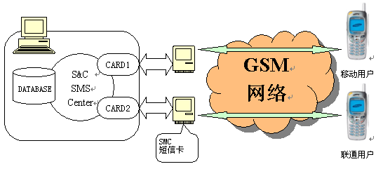 采用短信卡方式的短信系統結構如下圖,短消息通過內置PCI短信卡發(fā)送,通過靈活多變的接口,與其他系統集成,組成短信應用系統。