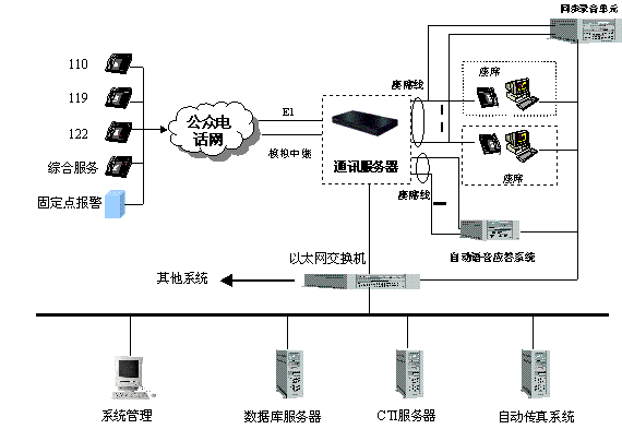 。1).110、119、122報(bào)警電話的傳送與集中接聽模式:所有轄區(qū)以內(nèi)的110、119、122報(bào)警電話都經(jīng)市電信局統(tǒng)一匯接,通過一條PCM2MBPS數(shù)字中繼送往市局指揮中心hxd09可編程智能語音交換機(jī)(簡(jiǎn)稱交換機(jī),下同)。再由交換機(jī)經(jīng)過數(shù)模轉(zhuǎn)換、排隊(duì)分配等處理后送往指揮中心各受理臺(tái)。此外,系統(tǒng)還備用了4條專用的模擬中繼線,用于當(dāng)PCM數(shù)字鏈路發(fā)生意外時(shí),作為傳送110、119、122報(bào)警電話的應(yīng)急備用專線。