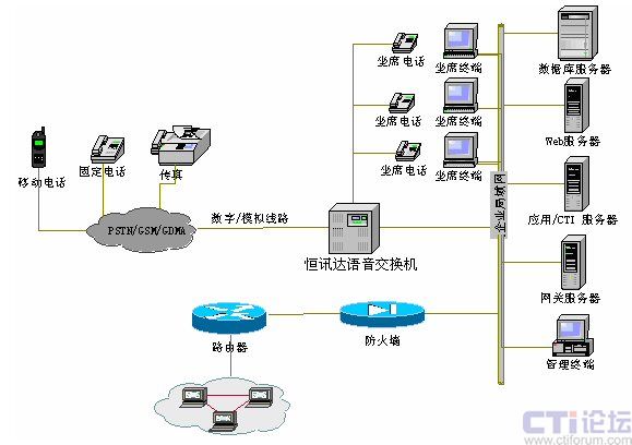 根據(jù)外包呼叫中心初期建設需求,基于HXD09交換機系統(tǒng)的客戶服務中心的網(wǎng)絡拓撲結(jié)構(gòu)如下圖所示: