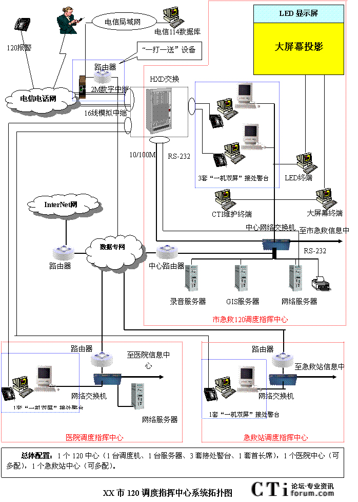 - 樹立大網(wǎng)絡概念:采用先進的通訊、計算機網(wǎng)絡技術(shù)(如CTI技術(shù)),利用現(xiàn)有的通信資源,實現(xiàn)市人民醫(yī)院120指揮中心與急救分站的計算機網(wǎng)絡及相關領導辦公室計算機大聯(lián)網(wǎng);形成全市范圍內(nèi)120有線、無線全方位立體調(diào)度語音通道大網(wǎng);為今后督查聯(lián)網(wǎng)、大聯(lián)動打下基礎。
