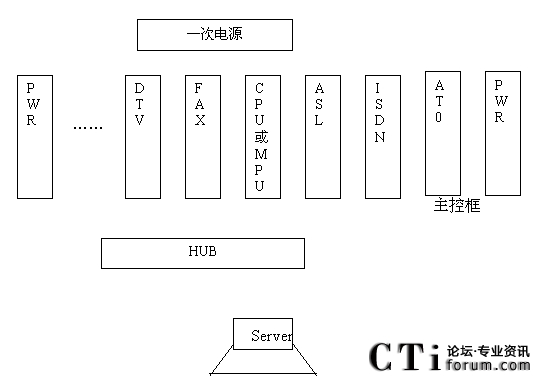 - CPU為256路主控板,對整個(gè)系統(tǒng)進(jìn)行主控,為整個(gè)系統(tǒng)提供時(shí)鐘入同步信號及交換網(wǎng),含一個(gè)10Base-T以太網(wǎng)口,通過HUB與Server進(jìn)行控制信息的交互