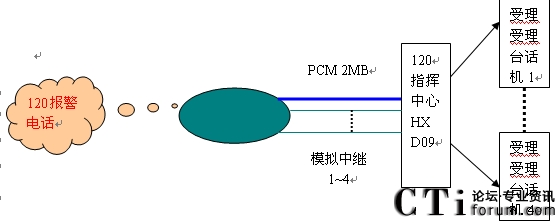 系統(tǒng)共包含4個(gè)E1,其中一個(gè)為公網(wǎng)呼入提供接口,另外三個(gè)可分別接入110、122(或120、119)。