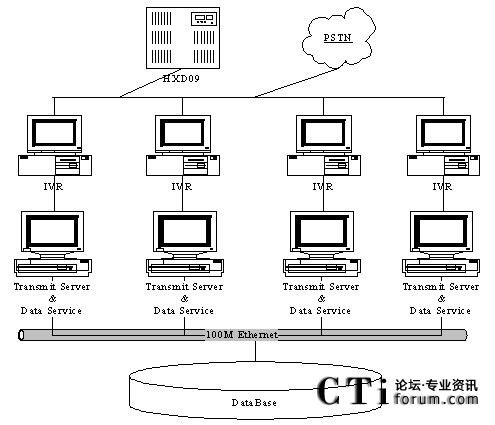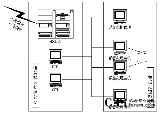 充值卡系統(tǒng)的硬件結構可以分為語音接入處理和數(shù)據(jù)處理兩大部分。
