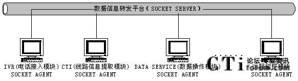 系統(tǒng)擁有的眾多的功能模塊程序都被設計成為一個個相對獨立的程序。每個程序都作為一個SOCKET AGENT登錄到系統(tǒng)擁有的數(shù)據(jù)信息轉發(fā)平臺(它實際上是一個SOCKET