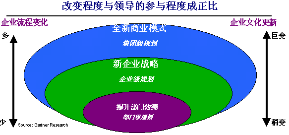 成功實施CRM的第一個關(guān)鍵是贏得企業(yè)的高層支持。高層支持的項目,或稱“一把手”工程,往往能夠推行得比較順利。在我們的實施中,最經(jīng)常項目牽頭人是客戶方負責運營的老總或總經(jīng)理。企業(yè)要應用CRM系統(tǒng),不應當僅僅是信息部門或銷售部門內(nèi)部的事情,而應當是整個企業(yè)在高層領導的直接參與指導之下的多方協(xié)同調(diào)整,因為CRM涉及的是市場、銷售、服務等多個與客戶打交道的部門和流程。企業(yè)內(nèi)部的高層管理者必須承擔起項目負責人的角色,才能讓CRM實施順利地開展,才能完成部門之間的協(xié)同,才能實現(xiàn)企業(yè)內(nèi)部的文化轉(zhuǎn)變。高層參與的程度可以由下面的圖示說明: