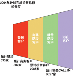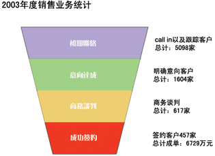 Billion終于明白了,公司虧損的癥結(jié)就在于,沒有將銷售計劃落到實處,即沒有根據(jù)客戶量及推進狀況來配置資源、控制業(yè)務(wù)流程,不能有效協(xié)調(diào)公司資源,導致公司整體工作能力沒有得到提升。2003年初,聽取朋友的建議,Billion的公司實施了CRM系統(tǒng),對公司的業(yè)務(wù)流程進行梳理和固化,作為公司管理者,Billion隨時可以看到銷售漏斗中的客戶轉(zhuǎn)化情況,并及時對公司運營過程中的弱點進行補充和加強。2003年終,Billion的公司做到了營業(yè)額180%增長,營銷投入僅有93%增長,公司盈利大大增加。Billion深有體會地說:“市場競爭日趨激烈,粗放的方法不再能滿足發(fā)展的需要。公司投入必須花在刀刃上,客戶資源計劃幫助我找到我的刀刃——提升公司的整體執(zhí)行能力。”