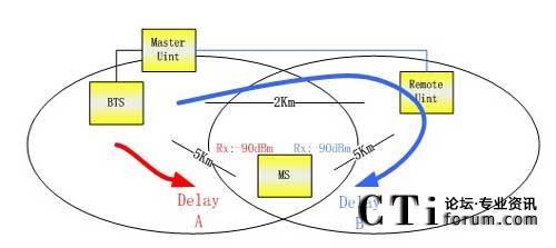 需要考慮GRRU站時延的引入對系統(tǒng)造成的影響?赡艽嬖诟采w區(qū)與施主扇區(qū)覆蓋區(qū)重疊的可能,如果兩重疊信號時延差小于4TA則不會造成任何問題,這是GSM規(guī)范規(guī)定的。當(dāng)兩信號時延差大于4TA且信號強(qiáng)度相當(dāng)(差值小于10dB)則將導(dǎo)致手機(jī)掉話;因此,這時需要考慮選取背向光纖直放站覆蓋區(qū)的施主扇區(qū),這樣基站重疊區(qū)和直放站重疊區(qū)就不會產(chǎn)生多徑引起的掉話了,而是兩個扇區(qū)信號的切換。