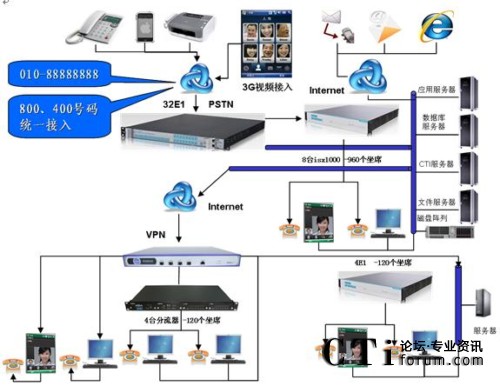 系統(tǒng)接入運(yùn)營商的數(shù)字中繼、Internet寬帶網(wǎng)絡(luò),單機(jī)最大可提供本地960個(gè)模擬坐席。通過VPN(單獨(dú)組建VPN或者利用防火墻VPN也可)可將IP坐席分布到能夠聯(lián)通網(wǎng)絡(luò)的局域網(wǎng)任意一端口電腦或者部署到傳統(tǒng)Internet廣域互聯(lián)網(wǎng)的另一城市的分支機(jī)構(gòu)。