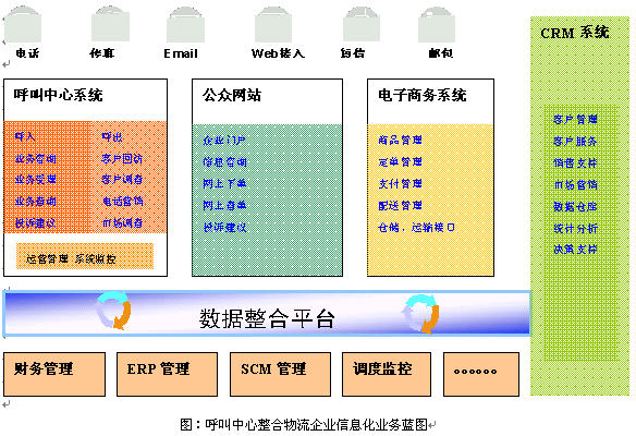為解決傳統(tǒng)物流企業(yè)"成本高"、"效率低"的瓶頸問題,物流行業(yè)信息化目前已經(jīng)超越了關(guān)注和觀望,第一層次的信息化平臺在很多企業(yè)已經(jīng)實施,如內(nèi)部的財務(wù)管理、倉儲管理、定單管理、運輸管理等,相關(guān)系統(tǒng)包括ERP、物流管理(LM)、SCM等應(yīng)用系統(tǒng)。更進一步,針對物流企業(yè)核心是提供"服務(wù)"這個概念,呼叫中心、電子商物、以及CRM技術(shù)的結(jié)合將對物流基礎(chǔ)信息平臺起到至關(guān)重要的整合作用: