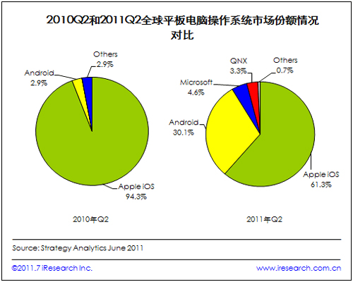 從平板電腦操作系統(tǒng)出發(fā),根據(jù)Strategy Analysis發(fā)布的數(shù)據(jù),2011Q2iOS的市場(chǎng)占比最大,為61.3%,其次為Android,占比為30.1%,windows以4.6%的占比位列第三。在平板電腦上,由于發(fā)展時(shí)間較短,競(jìng)爭(zhēng)格局會(huì)比智能手機(jī)市場(chǎng)簡(jiǎn)單一些。隨著市場(chǎng)的發(fā)展逐漸成熟,可以預(yù)見(jiàn),iOS的市場(chǎng)份額還將進(jìn)一步下降,而Android和Windows的市場(chǎng)占比則會(huì)上升。