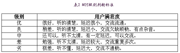 MOS(MeanOpinionScore)是一種常用的主觀評(píng)價(jià)標(biāo)準(zhǔn)。IP電話業(yè)務(wù)的MOS定義為四級(jí):4.0-5.0(優(yōu))、3.5-4.0(良)、3.0-3.5(中)、1.5-3.0(差)、0-1.5(劣)。用戶(hù)滿意度和MOS等級(jí)的對(duì)應(yīng)關(guān)系見(jiàn)表2。