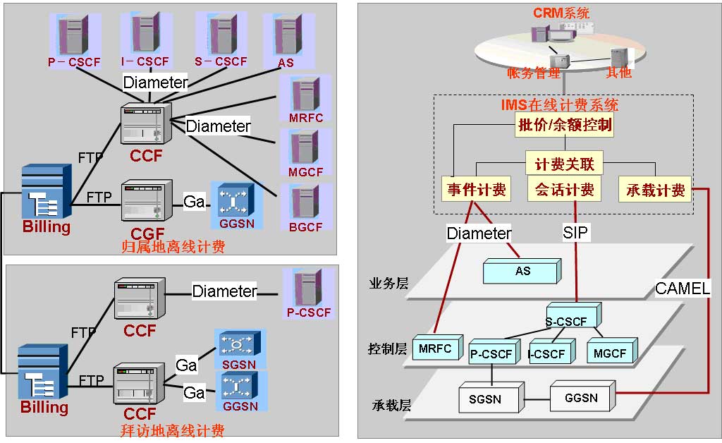 IMS體系既支持在線計費(fèi)(OCS)、也支持離線計費(fèi)(OFFLINE),OCS是指IMS實(shí)體(應(yīng)用服務(wù)器(AS)、CSCF和GGSN等)與在線計費(fèi)系統(tǒng)實(shí)時交互的過程,在此過程中OCS與用戶賬戶實(shí)時交互,并控制或監(jiān)控與服務(wù)有關(guān)的費(fèi)用。離線計費(fèi)主要在會話完成后收集計費(fèi)信息,系統(tǒng)不能實(shí)時影響所使用服務(wù)的過程。針對不同的業(yè)務(wù)和客戶群這兩種計費(fèi)模式將長期存在。