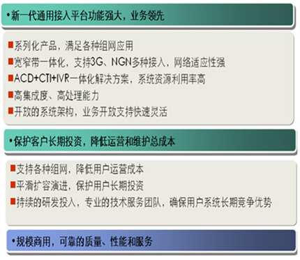 Telephony Integration),聯(lián)絡中心充分集成通信網(wǎng)、計算機網(wǎng)和信息領(lǐng)域的多項技術(shù),成為和企業(yè)連為一體的完整綜合信息服務系統(tǒng)。華為多媒體聯(lián)絡中心能夠高質(zhì)量、高效率、全方位地為企業(yè)和行業(yè)的客戶提供多種服務,從而實現(xiàn)企業(yè)的成本最小化和利潤最大化。